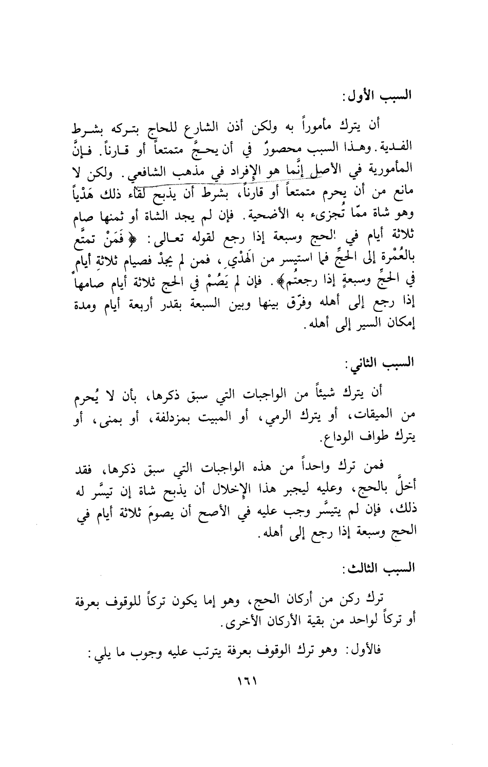 أن يترك مأموراً به ولكن أذن الشارع للحاج بتركه بشرط الفدية وهذا السبب محصور في أن يحج متمتعاً أو قارناً فإن المأمورية في الأصل إنما هو الإفراد في مذهب الشافعي. ولكن لا مانع من أن يحرم متمتعاً أو قارناً، بشرط أن يذبح لقاء ذلك هدياً وهو شاة مما تجزىء به الأضحية. فإن لم يجد الشاة أو ثمنها صام ثلاثة أيام في الحج وسبعة إذا رجع لقوله تعالى: {َمَن تَمَتَّعَ بِالْعُمْرَةِ إِلَى الْحَجِّ فَمَا اسْتَيْسَرَ مِنَ الْهَدْيِ فَمَن لَّمْ يَجِدْ فَصِيَامُ ثَلاثَةِ أَيَّامٍ فِي الْحَجِّ وَسَبْعَةٍ إِذَا رَجَعْتُمْ} فإن لم يصم في الحج ثلاثة أيام صامها إذا رجع إلى أهله وفرق بينهما وبين السبعة بقدر أربعة أيام ومدة إمكان السير إلى أهله.