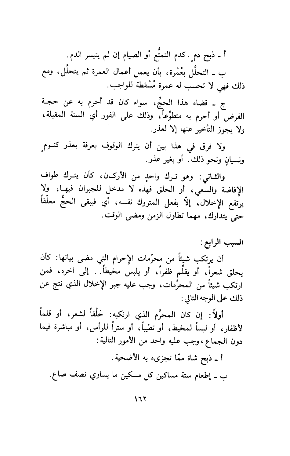 أن يرتكب شيئاً من محرمات الإحرام التي مضى بيانها: كأن يحلق شعراً، أو يقلم ظفراً، أو يلبس مخيطاً ... إلى آخرة، فمن ارتكب شيئاً من المحرمات، وجب عليه جبر الإخلال الذي نتج عن ذلك على الوجه التالي: