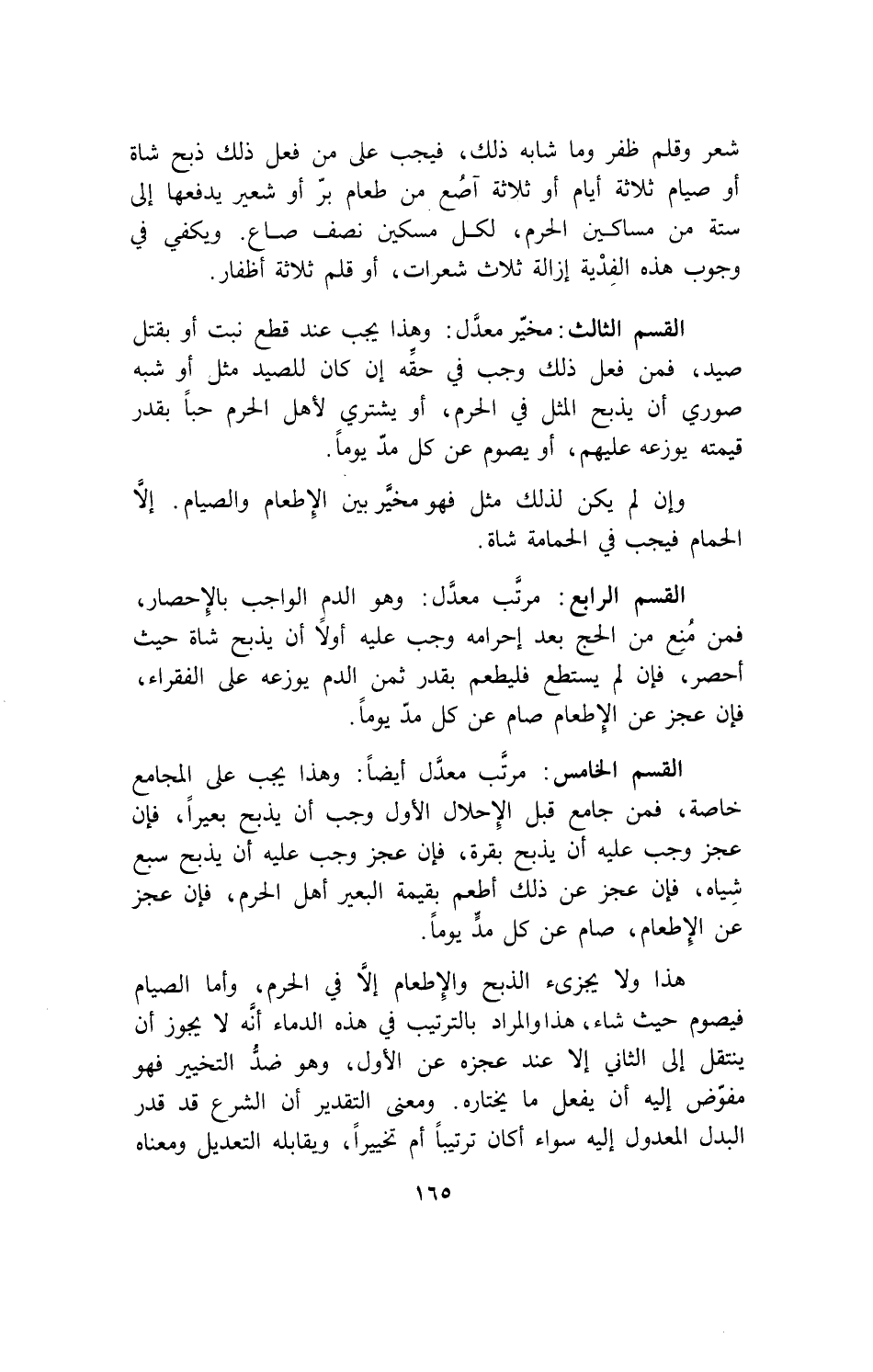 القسم الخامس: مرتب معدل أيضاً: وهذا يجب على المجامع خاصة، فمن جامع قبل الإحلال وجب أن يذبح بعيراً، فإن عجز وجب عليه أن يذبح بقرة، فإن عجز وجب عيه أن يذبح سبع شياه، فإن عجز عن ذلك أطعم بقيمة البعير أهل الحرم، فإن عجز عن الإطعام، صام عن كل مد يوماً.