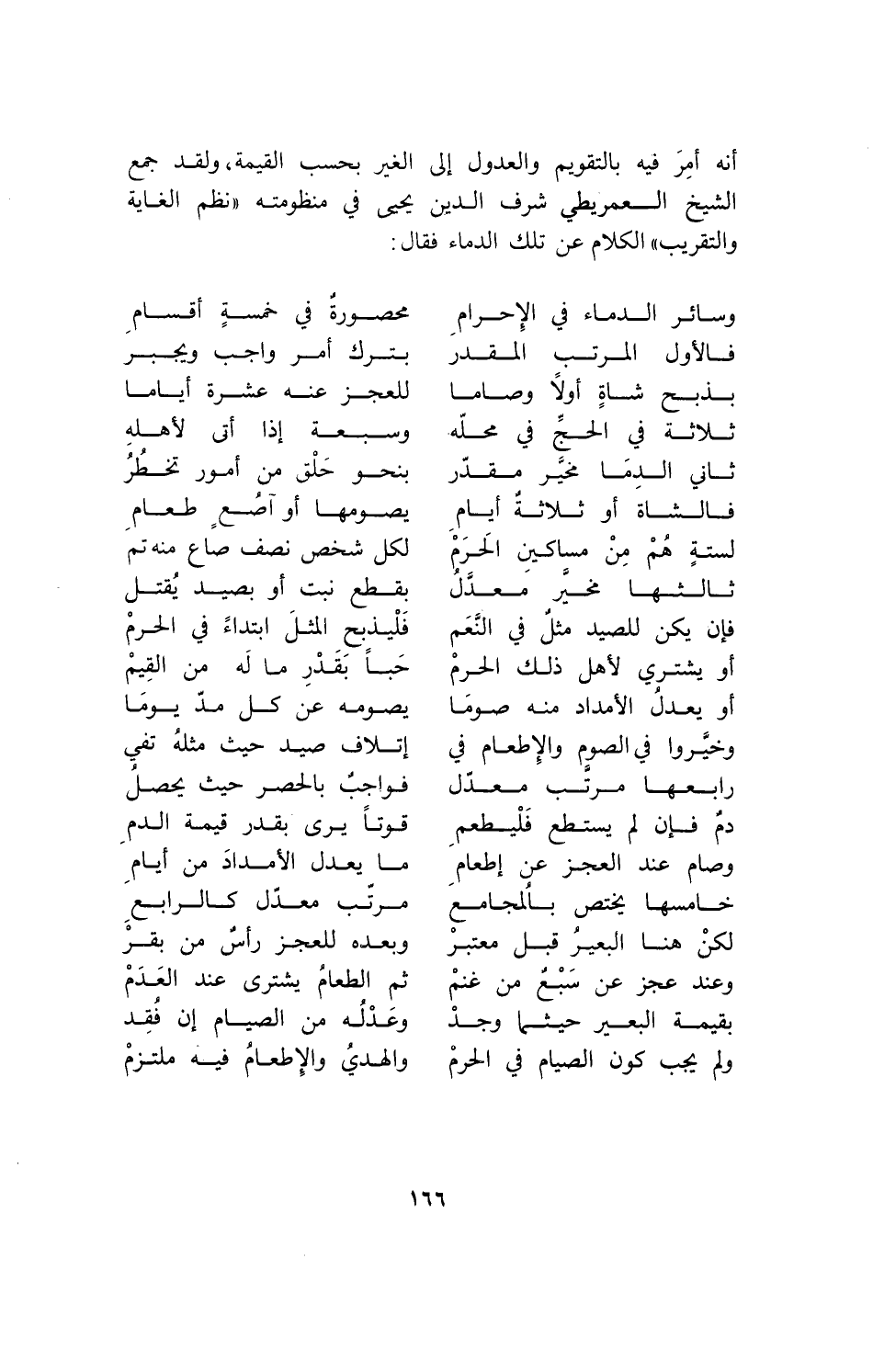 أنه أمر فيه بالتقويم والعدول إلى الغير بحسب القيمة، ولقد جمع الشيخ العمريطي شرف الدين يحي في منظومته "نظم الغاية والتقريب" الكلام عن تلك الدماء فقال: