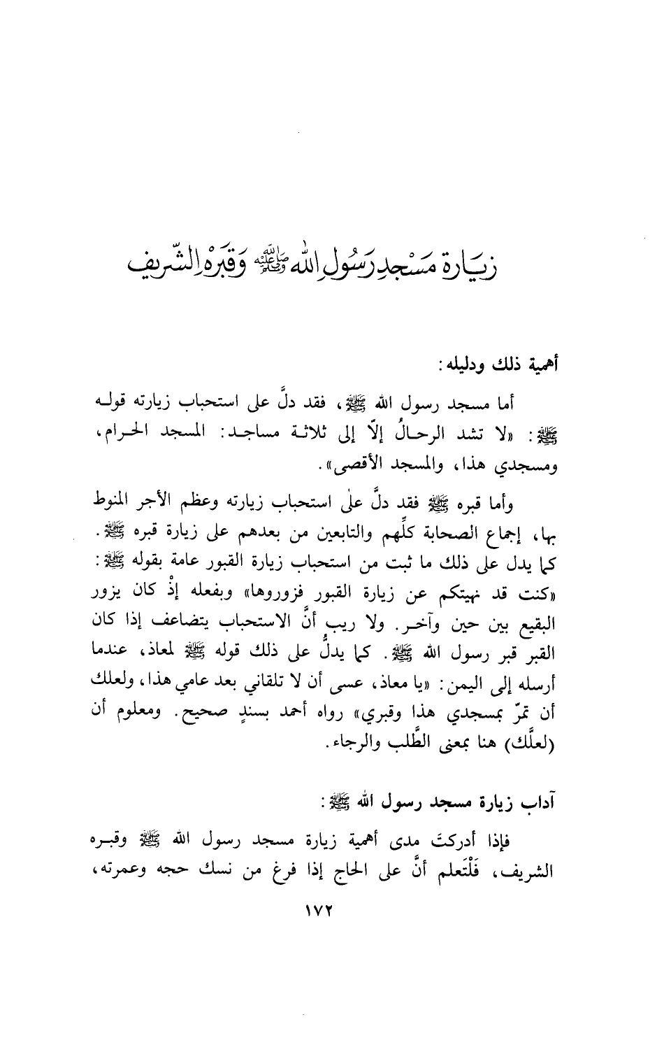 أما مسجد رسول الله - صلى الله عليه وسلم - فقد دل على استحباب زيارته قوله - صلى الله عليه وسلم -: " لا تشد الرحال إلا إلى ثلاثة مساجد: المسجد الحرام، ومسجدي هذا، والمسجد الأقصى ".