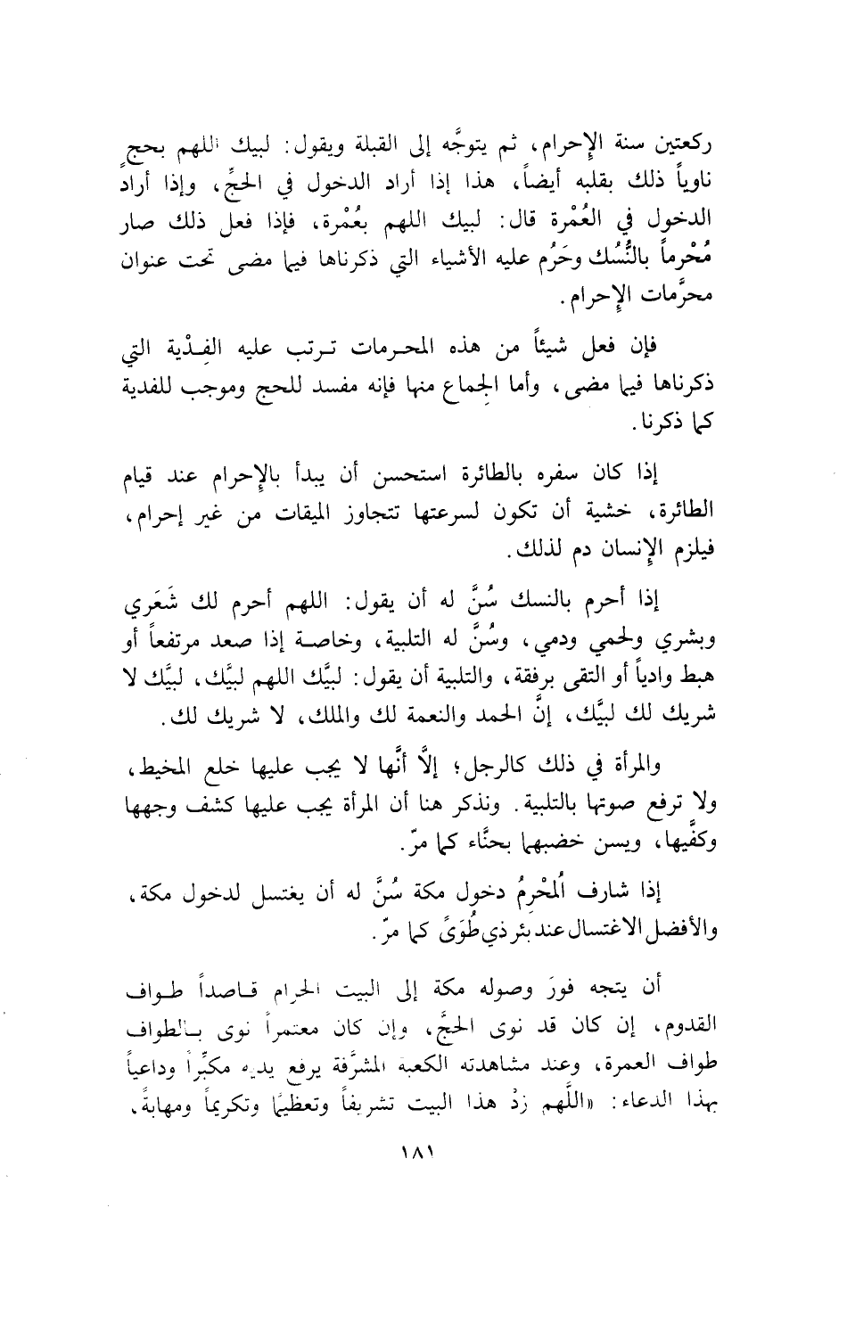 ركعتين سنة الإحرام، ثم يتوجه إلى القبلة ويقول: لبيك اللهم بحج ناوياً ذلك بقلبه أيضاً، هذا إذا أراد الدخول في الحج، وإذا أراد الدخول في العمرة قال: لبيك الهم بعمرة، فإذا فعل ذلك صار محرماً بالنسك وحرم عليه الأشياء التي ذكرناها فيما مضى تحت عنوان محرمات الإحرام.