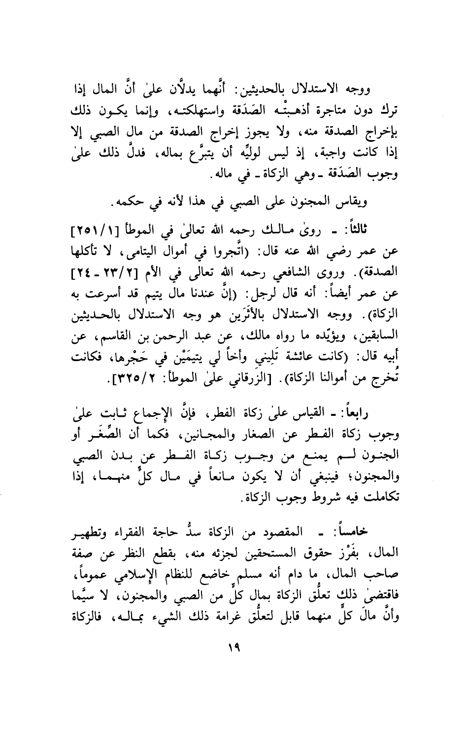 خامساً: المقصود من الزكاة سدُّ حاجة الفقراء وتطهير المال، بفرز حقوق المستحقين لجزئه منه، بقطع النظر عن صفة صاحب المال، ما دام أنه مسلم خاضع للنظام الإسلامي عموماً، فاقتضى ذلك تعلق الزكاة بمال كل من الصبي والمجنون، لاسيما وأن مال كل منهما قابل، لتعلق غرامة ذلك الشيء بماله، فالزكاة