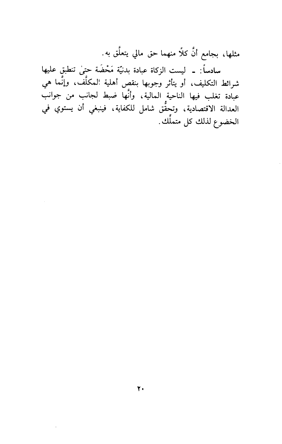 سادساً: ليست الزكاة عبادة بدنية محضة حتى تنطبق عليها شرائط التكليف، أو يتأثر وجوبها بنقص أهليه المكلف، وإنما هي عبادة تغلب فيها الناحية المالية، وأنها ضبط لجانب من جوانب العدالة الاقتصادية، وتحقق شامل للكفاية، فينبغي أن يستوي في الخضوع لذلك كل متملك.