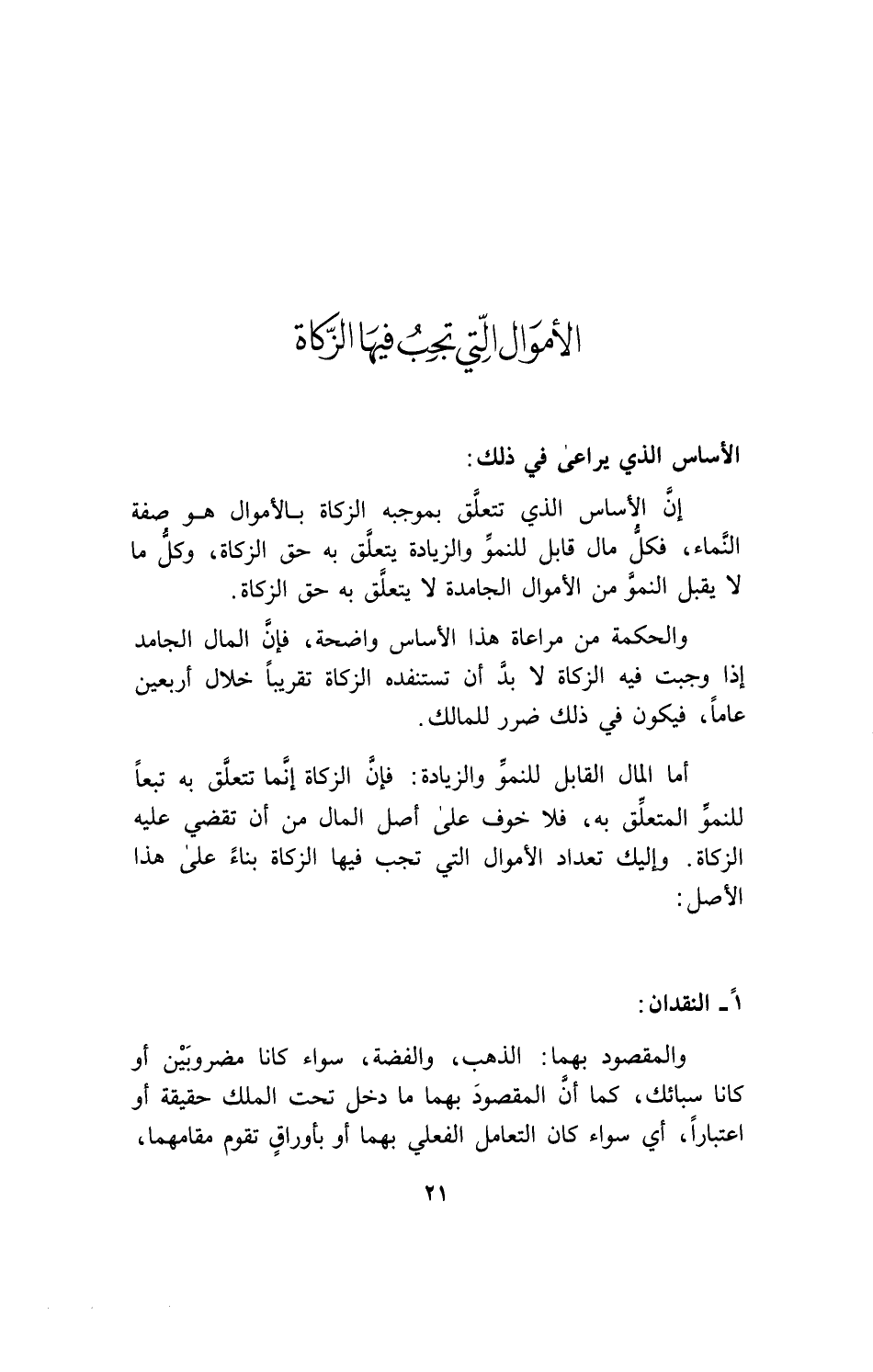 إن الأساس الذي تتعلق بموجبه الزكاة بالأموال هو صفة النماء، فكل مال قابل للنمو والزيادة يتعلق به حق الزكاة، وكل ما لا يقبل النمو من الأموال الجامدة لا يتعلق به حق الزكاة.