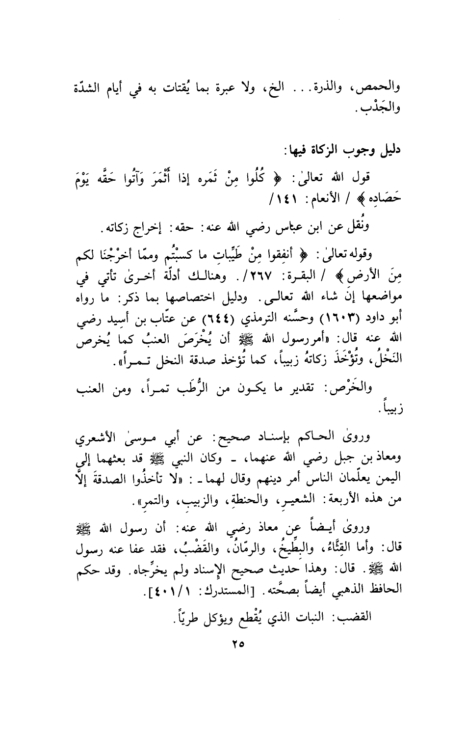 وروى الحاكم بإسناد صحيح: عن أبي موسى الأشعري ومعاذ بن جبل رضي الله عنهما، وكان النبي - صلى الله عليه وسلم - قد بعثها إلى اليمن يعلمان الناس أمر دينهم وقال لهما: " لا تأخذوا الصدقة إلا من هذه الأربعة: الشعير، والحنطة، والزبيب، والتمر ".