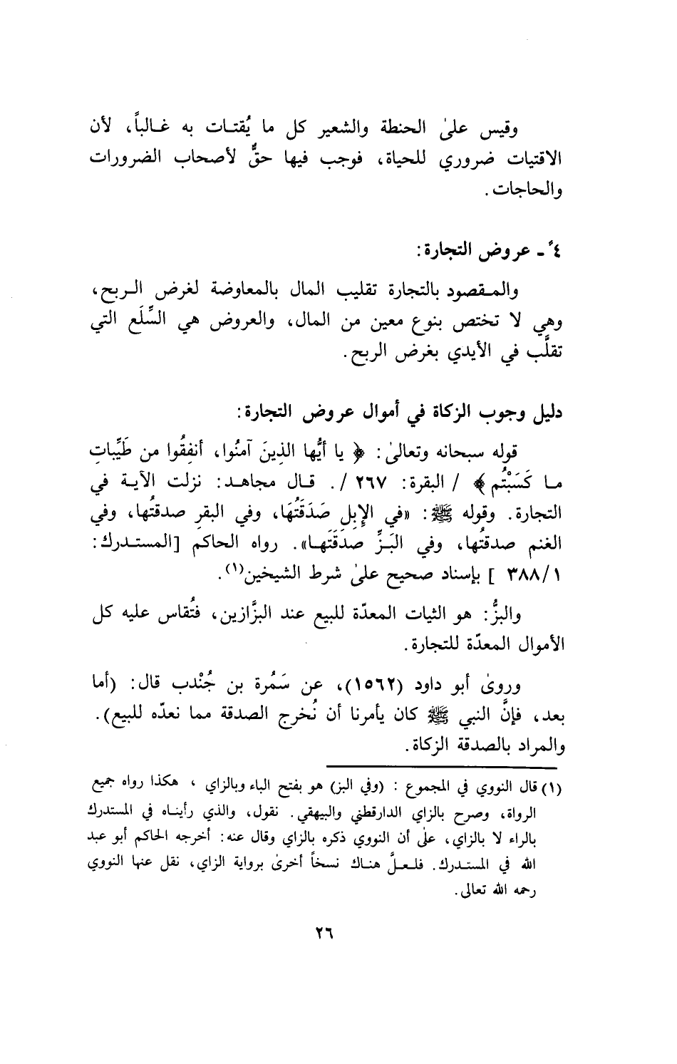 قوله سبحانه وتعالى: {يَا أَيُّهَا الَّذِينَ آمَنُواْ أَنفِقُواْ مِن طَيِّبَاتِ مَا كَسَبْتُمْ} / البقرة: 267 /، قال مجاهد: نزلت الآية في التجارة، وقوله - صلى الله عليه وسلم -: " في الإبل صدقتها، وفي البقر صدقتها، وفي الغنم صدقتها، وفي البز صدقتها " رواه الحاكم [المستدرك: 1/ 388] بإسناد صحيح على شرط الشيخين. (¬1)
