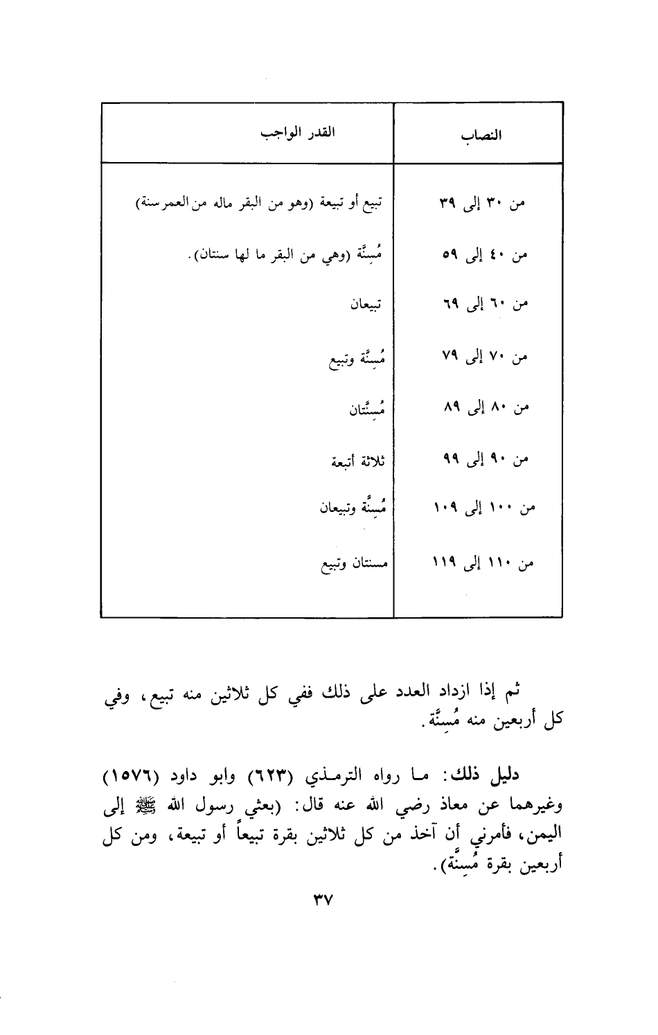 دليل ذلك: ما رواه الترمذي (623) وأبوداود (1576) وغيرهما عن معاذ - رضي الله عنه - قال: (بعثني رسول الله - صلى الله عليه وسلم - إلى اليمن، فأمرني أن آخذ من كل ثلاثين بقرة تبيعاً أو تبيعة، ومن كل أربعين بقرة مسنة).