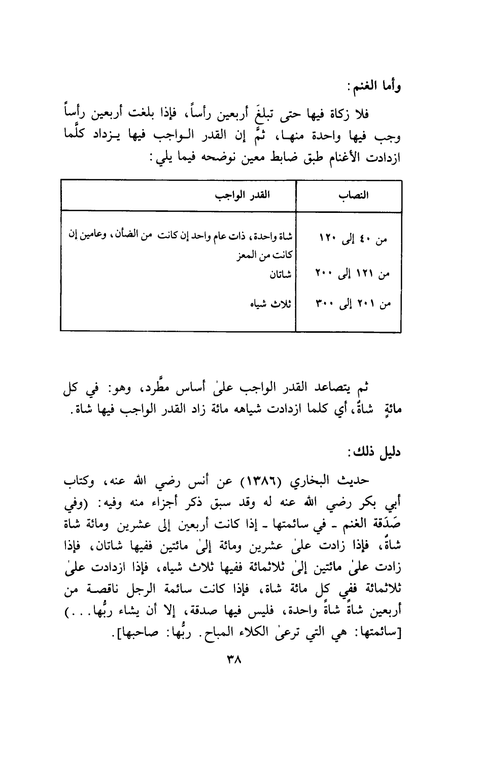حديث البخاري (1386) عن أنس - رضي الله عنه -، وكتاب أبي بكر - رضي الله عنه - له وقد سبق ذكر أجزاء منه وفيه: (وفي صدقة الغنم ـ في سائمتها ـ إذا كانت أربعين إلى عشرين ومائة شاة شاة، فإذا زادت على عشرين ومائة إلى مائتين ففيها شاتان، فإذا زادت على مائتين إلى ثلاثمائة ففيها ثلاث شياه، فإذا ازدادت على ثلاثمائة ففي كل مائة شاه، فإذا كانت سائمة الرجل ناقصة من أربعين شاة شاة واحدة، فليس فيها صدقة، إلا أن يشاء ربها ... .. )