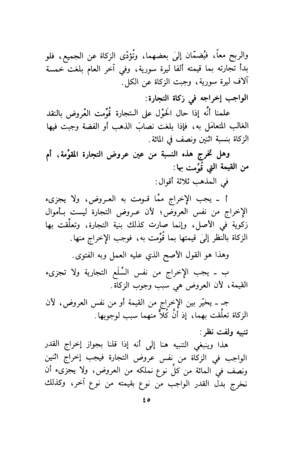 والربح معاً، فيضمان إلى بعضهما، وتؤدي الزكاة عن الجميع، فلو بدأ تجارته بما قيمته ألفا ليرة سورية، وفي آخر العام بلغت خمسة آلاف ليرة سورية، وجبت الزكاة عن الكل.