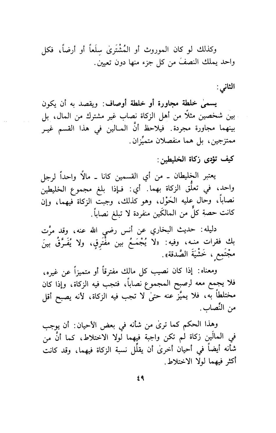 ومعناه: إذا كان نصيب كل مالك مفترقاً أو متميزاً عن غيره، فلا يجمع معه ليصبح المجموع نصاباً، فتجنب فيه الزكاة، وإذا كان مختلطاً به، فلا يميز عنه حتى لا تجب فيه الزكاة، لأنه يصبح أقل من النصاب.