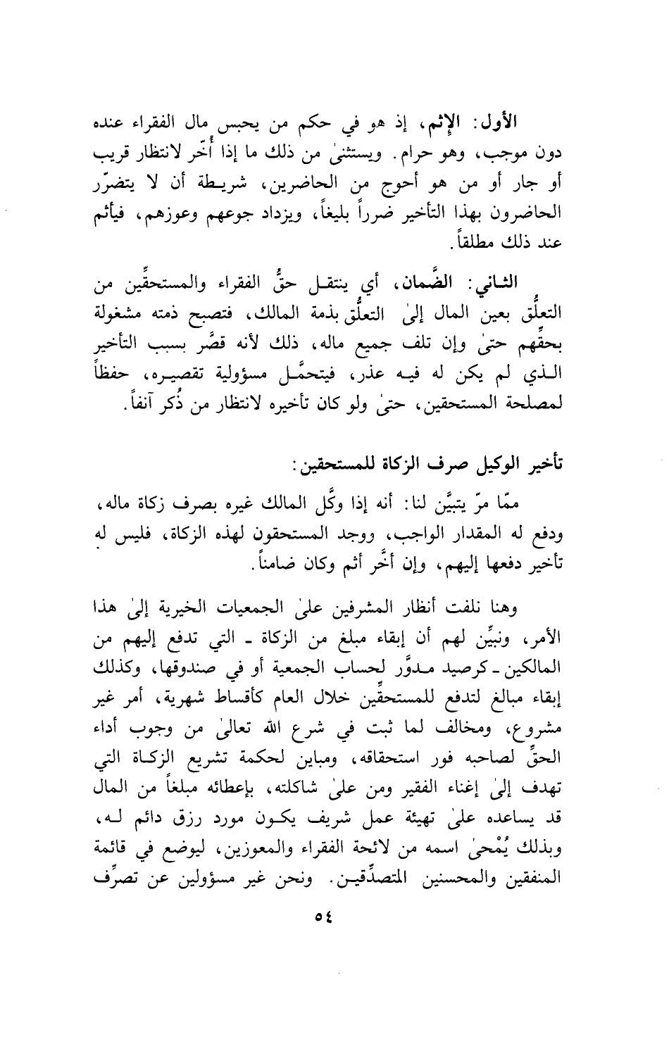 وهنا نلفت أنظار المشرفين على الجمعيات الخيرية إلى هذا الأمر ونبين لهم أن إبقاء مبلغ الزكاة - التي تدفع إليهم من المالكين - كرصيد مدور لحساب الجمعية أو في صندوقها، وكذلك إبقاء مبالغ لتدفع للمستحقين خلال العام كأقساط شهرية، أمر غير مشروع، ومخالف لما ثبت في شرع الله تعالى، من وجوب أداء الحق لصاحبه فور استحقاقه، ومباين لحكمة تشريع الزكاة التي تهدف إلى إغناء الفقير ومن على شاكلته، بإعطائه مبلغاً من المال قد يساعده على تهيئة عمل شريف يكون مورد رزق دائم له، وبذلك يمحى اسمه من لائحة الفقراء والمعوزين، ليوضع في قائمة المنفقين والمحسنين المتصدقين. ونحن غير مسؤولين عن تصرف