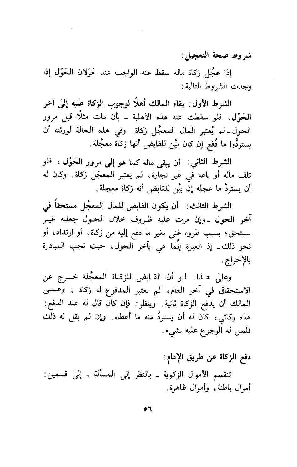 الشرط الأول: بقاء المالك أهلا لوجوب الزكاة عليه إلى آخر الحول، فلو سقطت عنه هذه الأهلية ـ بأن مات مثلاُ قبل مرور الحول ـ لم يعتبر المال المعجل زكاة. وفي هذه الحالة لورثته أن يستردوا ما دفع إن كان بين للقابض أنها زكاة معجلة.