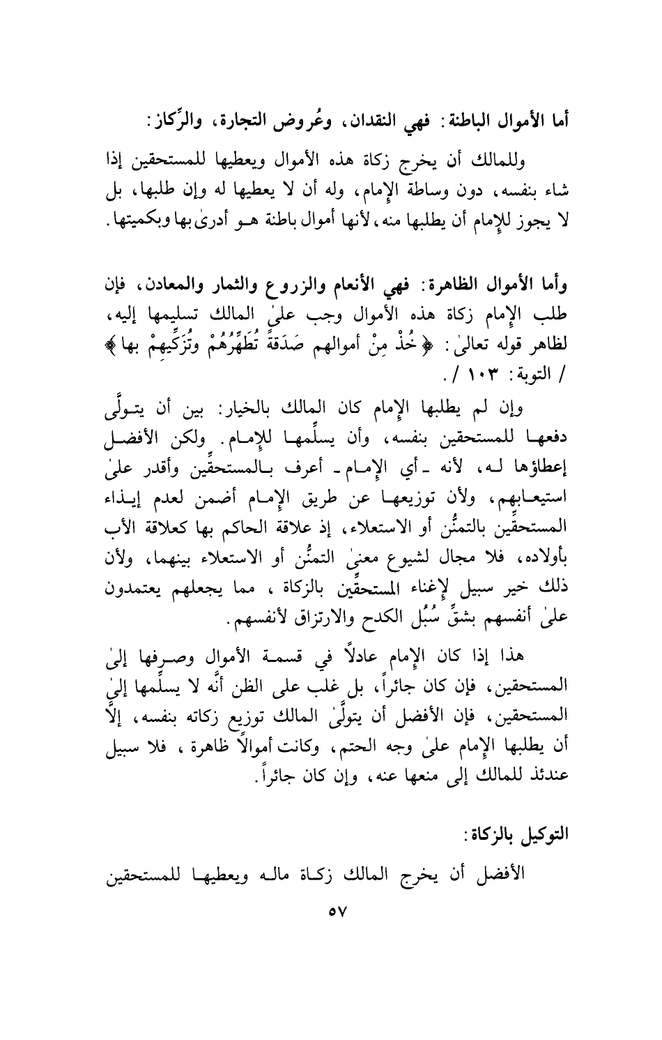 وأما الأموال الظاهرة: فهي الأنعام والزروع والثمار والمعادن، فإن طلب الإمام زكاة هذه الأمور وجب على المالك تسليمها إليه، لظاهر قوله تعالى: (خُذْ مِنْ أَمْوَالِهِمْ صَدَقَةً تُطَهِّرُهُمْ وَتُزَكِّيهِم بِهَا) التوبة: 103