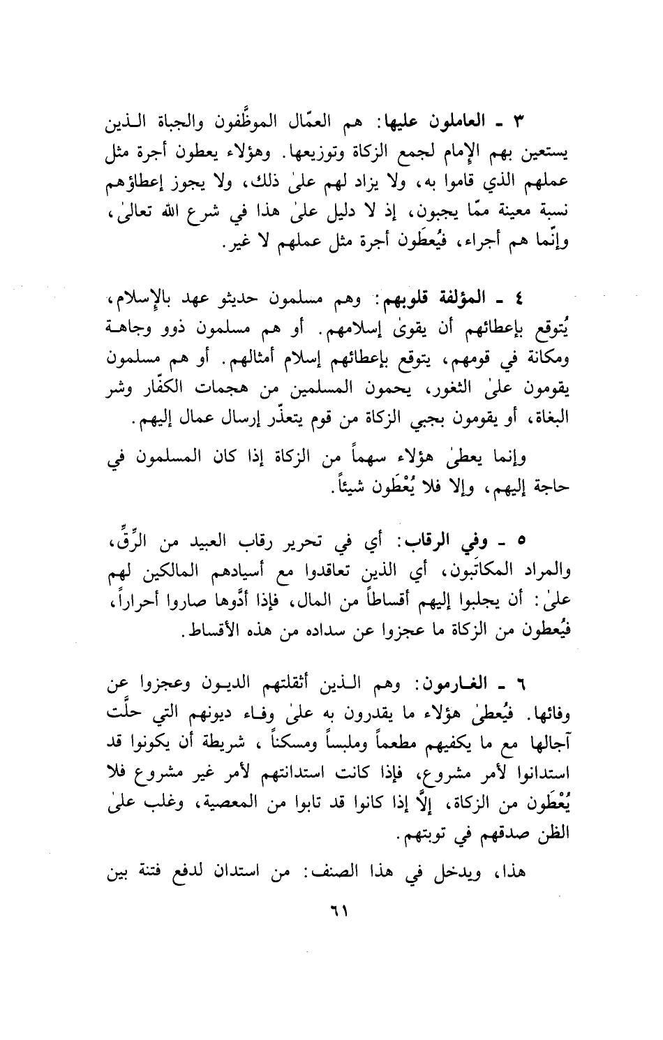 4ـ المؤلفة قلوبهم: وهم مسلمون حديثو عهد الإسلام، يتوقع بإعطائهم أن يقوى إسلامهم. أو هم مسلمون ذوو وجاهة ومكانة في قومهم، يتوقع بإعطائهم إسلام أمثالهم. أو هم مسلمون يقومون على الثغور، يحمون المسلمين من هجمات الكفار وشر البغاة، أو يقومون بجبي الزكاة من قوم يتعذر إرسال عمال إليهم.