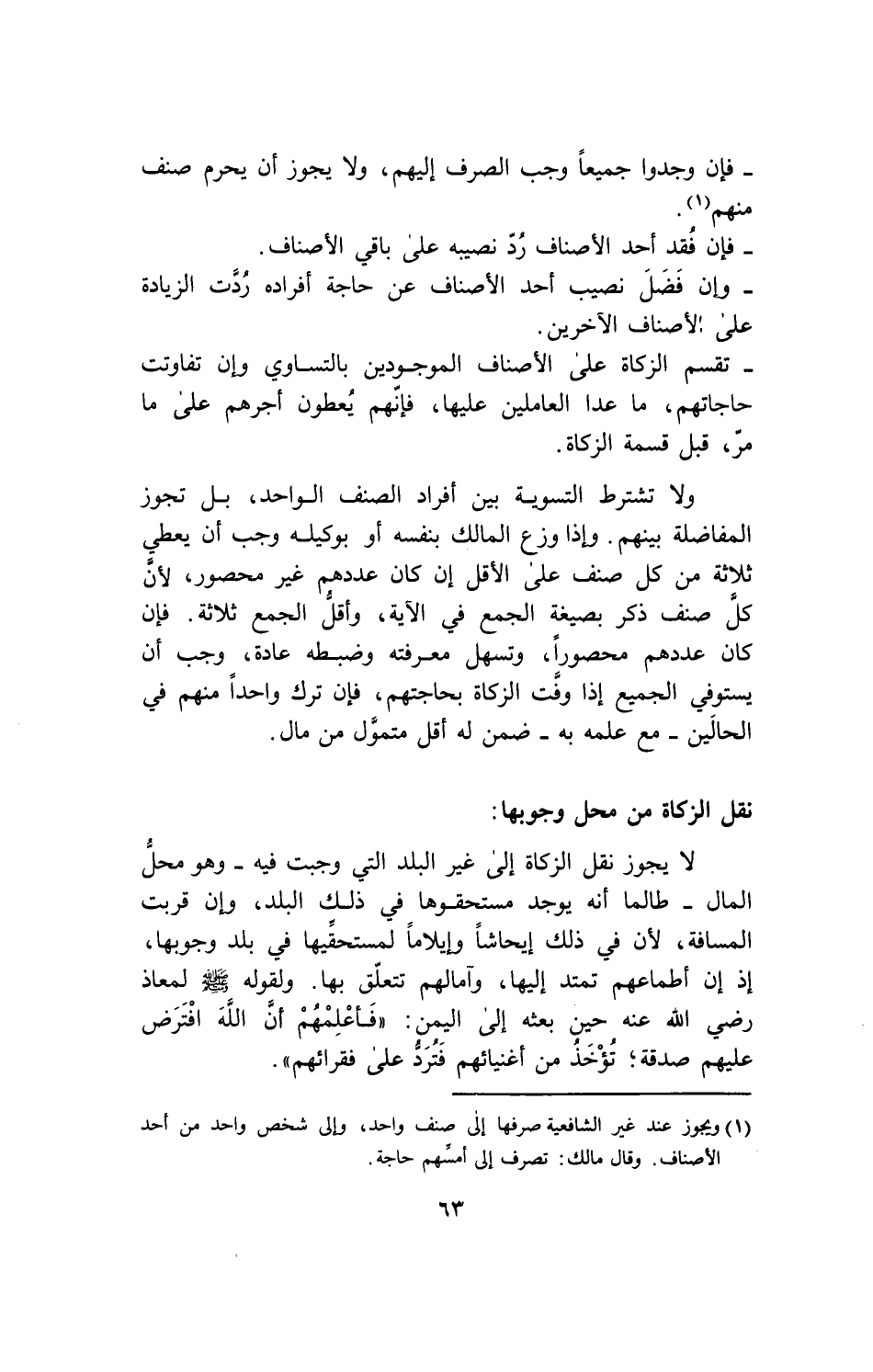 (¬1) ويجوز عند غير الشافعية صرفها إلى صنف واحد، وإلى شخص واحد من احد الأصناف. وقال مالك: تصرف إلى أمسهم حاجة.