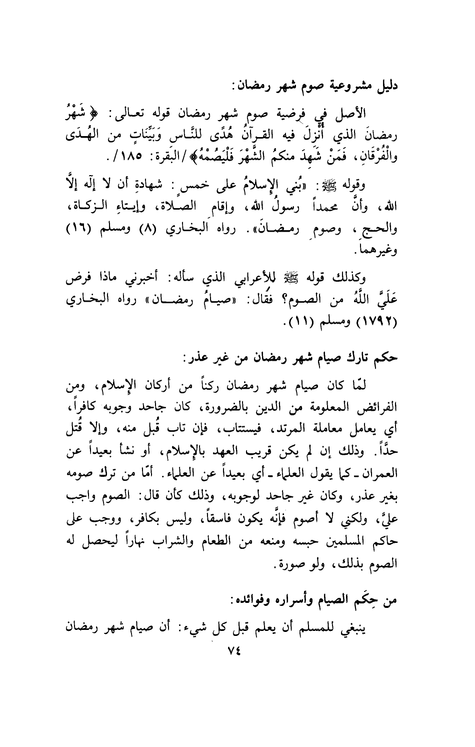 وقوله - صلى الله عليه وسلم -: " بني الإسلام على خمس شهادة أن لا إله إلا الله، وأن محمداً رسول الله، وإقام الصلاة، وإيتاء الزكاة، والحج، وصوم رمضان " رواه البخاري (8) ومسلم (16) وغيرهما.
