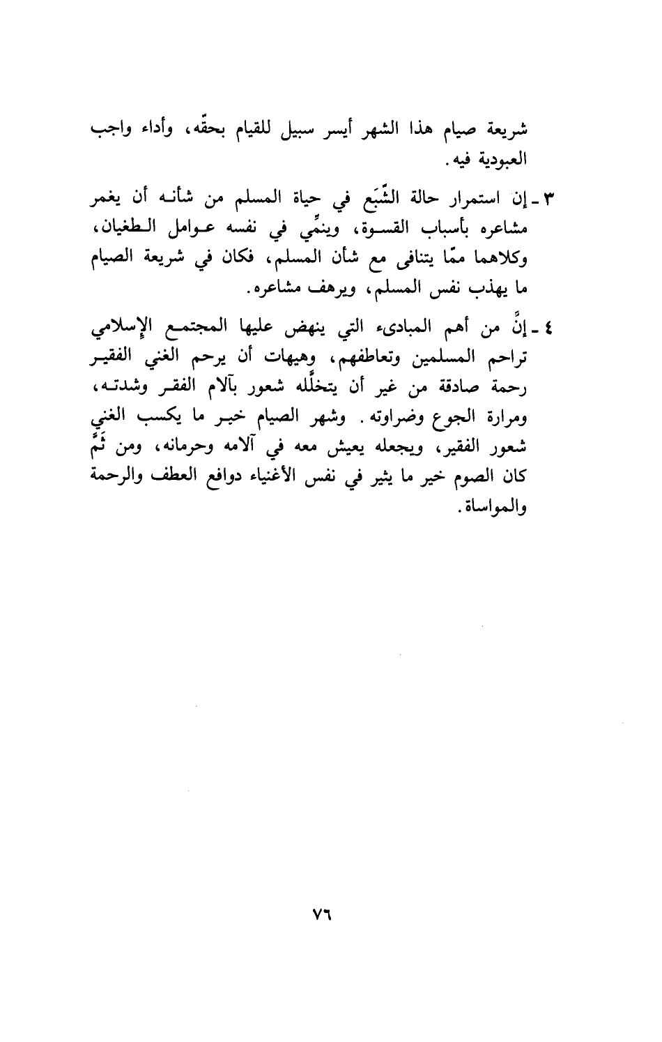 4ـ إن من أهم المبادئ التي ينهض عليها المجتمع الإسلامي تراحم المسلمين وتعاطفهم، وهيهات أن يرحم الغني الفقير رحمة صادقة من غير أن يتخلله شعور بآلام الفقر وشدته، ومرارة الجوع وضراوته. وشهر الصيام خير ما يكسب الغني شعور الفقير، ويجعله يعيش معه في آلامه وحرمانه، ومن ثم كان الصوم خير ما يثير في نفس الأغنياء دوافع العطف والرحمة والمواساة.