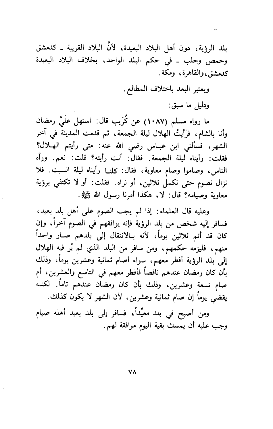 وعليه قال العلماء: إذا لم يجب الصوم على أهل بلد بعيد فسافر إليه شخص من بلد الرؤية فإنه يوافقهم في الصوم آخراً، وإن كان قد أتم ثلاثين يوماً، لأنه بالانتقال إلى بلدهم صار واحداً منهم، فيلزمه حكمهم، ومن سافر من البلد الذي لم ير فيه الهلال إلى بلد الرؤية أفطر معهم، سواء أصام ثمانية وعشرين يوماً، وذلك بأن كان رمضان عندهم ناقصاً فأفطر معهم في التاسع والعشرين، أم صام تسعة وعشرين، وذلك بأن كان رمضان عندهم تاماً لكنه يقضي يوماً إن صام ثمانية وعشرين، لأن الشهر لا يكون كذلك.