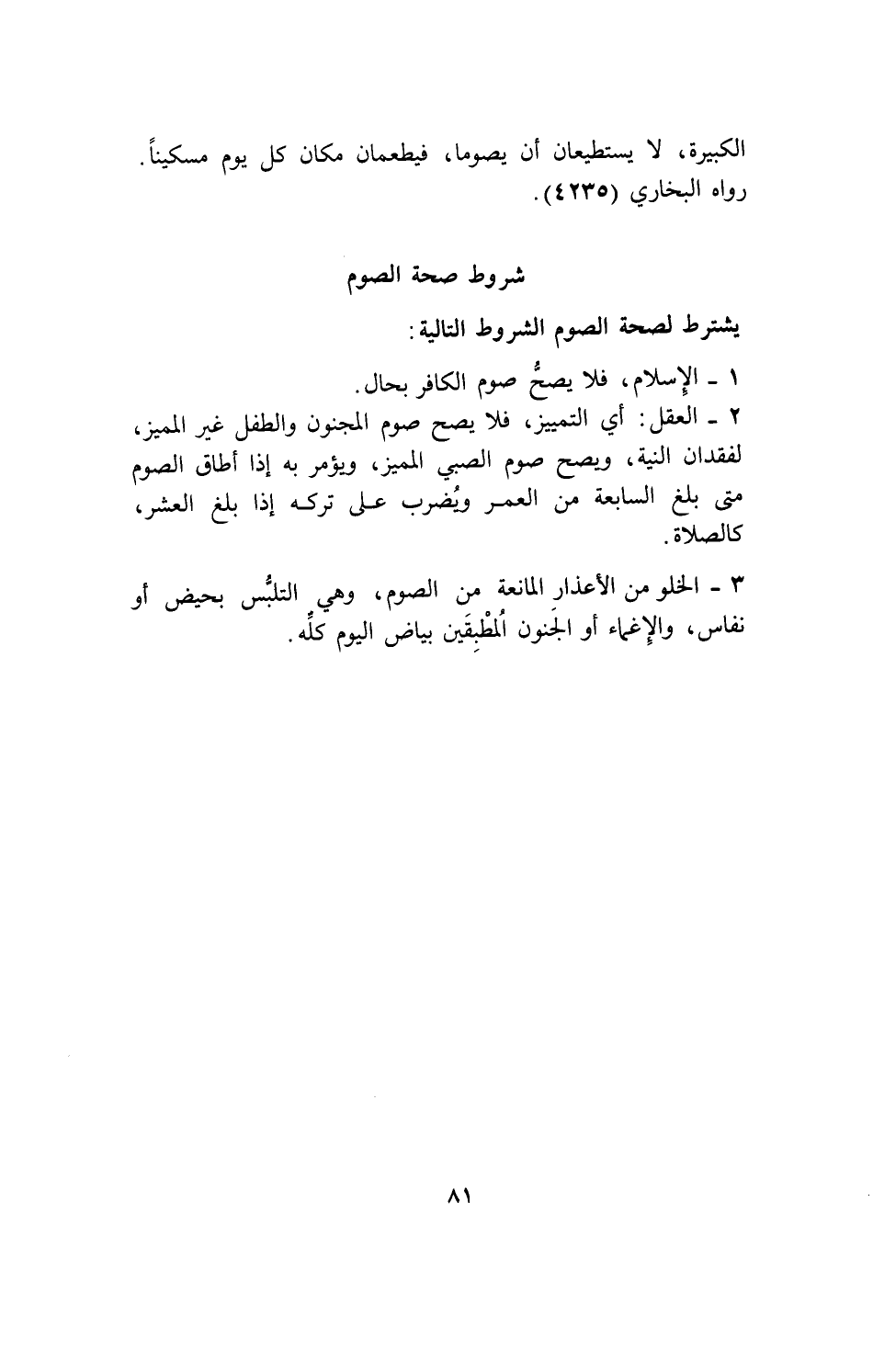3ـ الخلو من الأعذار المانعة من الصوم، وهي التلبس بحيض أو نفاس، والإغماء أو الجنون المطبقين بياض اليوم كله.