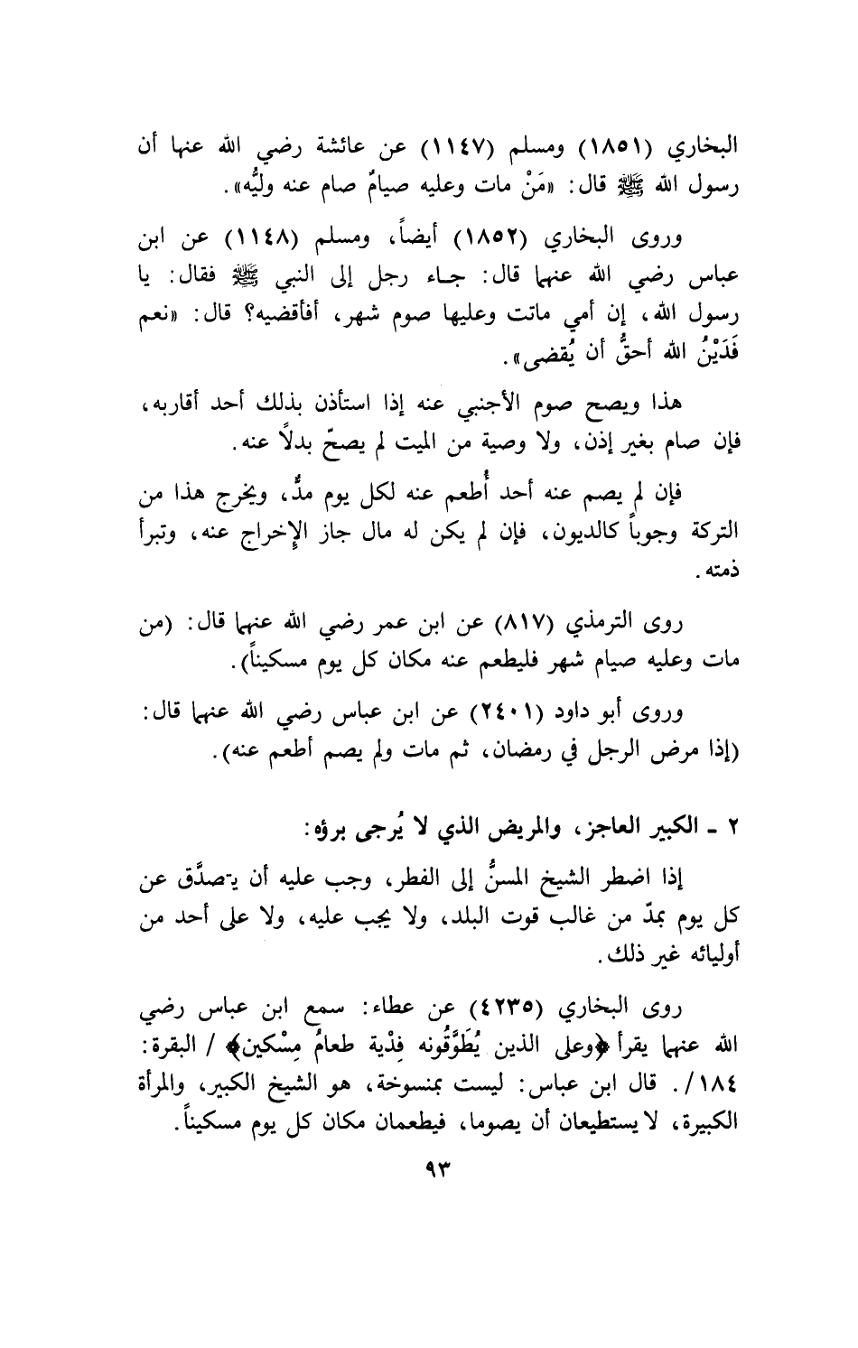 2ـ الكبير العاجز، والمريض الذي لا يرجى برؤه: