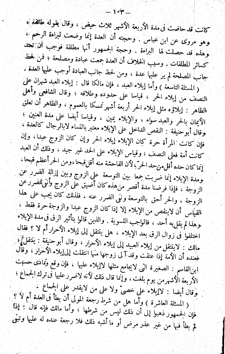(المسألة التاسعة) وأما إيلاء العبد فإن مالكا قال إيلاء العبد شهران على النصف من إيلاء الحر قياسا على حدوده وطلاقه.