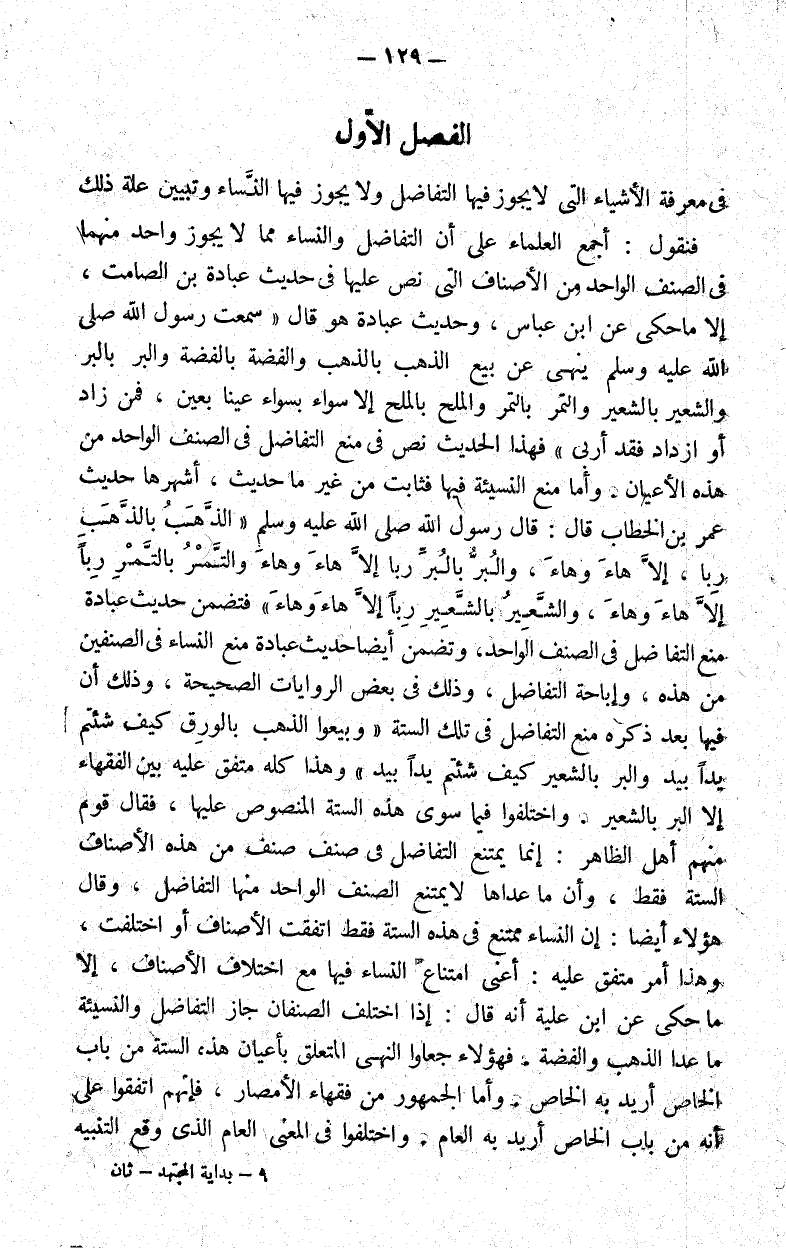 في معرفة الأشياء التي لا يجوز فيها التفاضل ولا يجوز فيها النساء وتبيين علة ذلك فنقول أجمع العلماء على أن التفاضل والنساء مما لا يجوز واحد منهما في الصنف الواحد من الأصناف التي نص عليها في حديث عبادة بن الصامت إلا ما حكي عن ابن عباس وحديث عبادة هو قال " سمعت رسول الله صلى الله عليه وسلم ينهى عن بيع الذهب بالذهب والفضة بالفضة والبر بالبر والشعير بالشعير والتمر بالتمر والملح بالملح إلا سواء بسواء عينا بعين فمن زاد أو ازداد فقد.أربى" فهذا الحديث نص في منع التفاضل في الصنف الواحد من هذه الأعيان.
