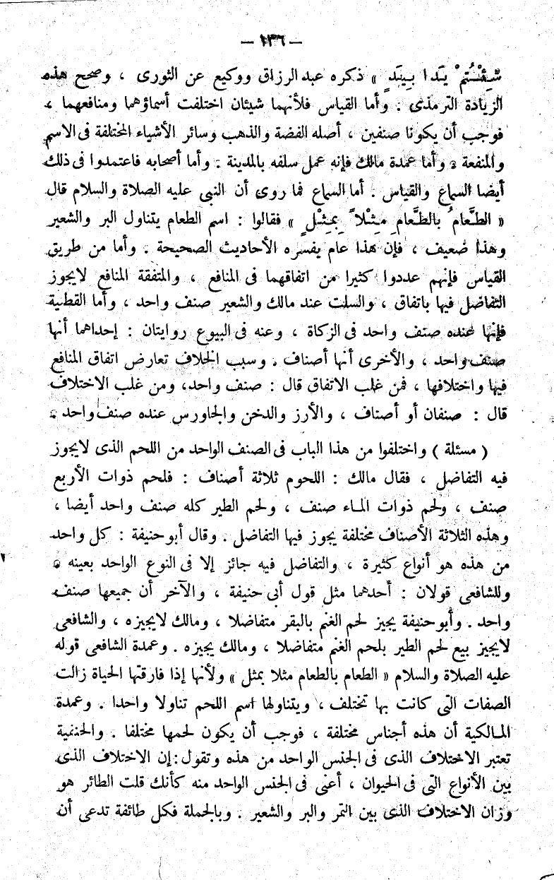 والحنفية تعتبر الاختلاف الذي في الجنس الواحد من هذه وتقول إن الاختلاف الذي بين الأنواع التي في الحيوان أعني في الجنس الواحد منه كأنك قلت الطائر هو وزان الاختلاف الذي بين التمر والبر والشعير.