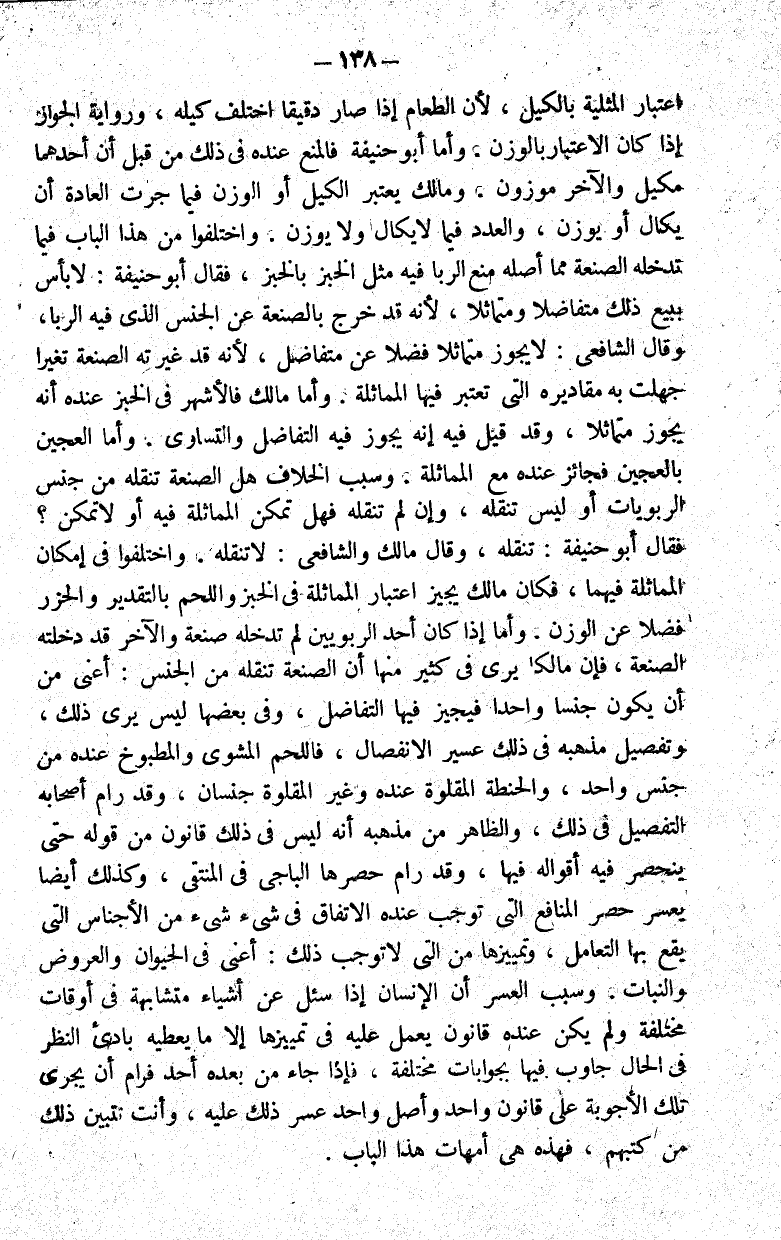 ذلك عسير الانفصال فاللحم المشوي والمطبوخ عنده من جنس واحد والحنطة المقلوة عنده وغير المقلوة جنسان وقد رام أصحابه التفصيل في ذلك والظاهر من مذهبه أنه ليس في ذلك قانون من قوله حتى تنحصر فيه أقواله فيها وقد رام حصرها الباجي في المنتقى وكذلك أيضا يعسر حصر المنافع التي توجب عنده الاتفاق في شيء شيء من الأجناس التي يقع بها التعامل وتمييزها من التي لا توجب ذلك أعني في الحيوان والعروض والنبات وسبب العسر أن الإنسان إذا سئل عن أشياء متشابهة في أوقات مختلفة ولم يكن عنده قانون يعمل عليه في تمييزها إلا ما يعطيه بادئ النظر في الحال جاوب فيها بجوابات مختلفة فإذا جاء من بعده أحد فرام أن يجري تلك الأجوبة على قانون واحد وأصل واحد عسر ذلك عليه وأنت تتبين ذلك من كتبهم فهذه هي أمهات هذا الباب.