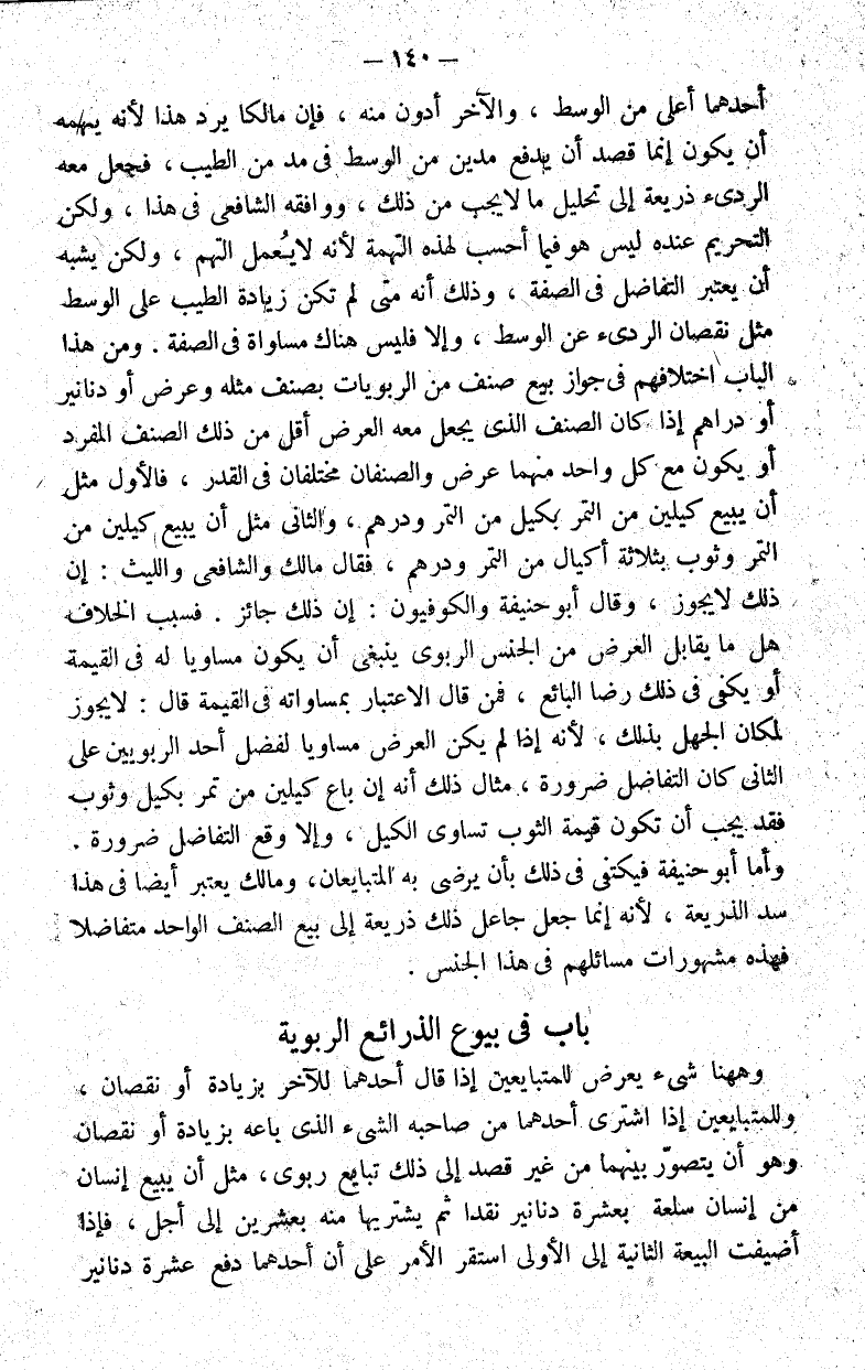 أحدهما أعلى من الوسط والآخر أدون منه فإن مالكا يرد هذا لأنه يتهمه أن يكون إنما قصد أن يدفع مدين من الوسط في مد من الطيب فجعل معه الرديء ذريعة إلى تحليل ما لا يجب من ذلك ووافقه الشافعي في هذا ولكن التحريم عنده ليس هو فيما أحسب لهذه التهمة لأنه لا يعمل التهم ولكن يشبه أن يعتبر التفاضل في الصفة وذلك أنه متى لم تكن زيادة الطيب على الوسط مثل نقصان الرديء عن الوسط وإلا فليس هناك مساواة في الصفة.