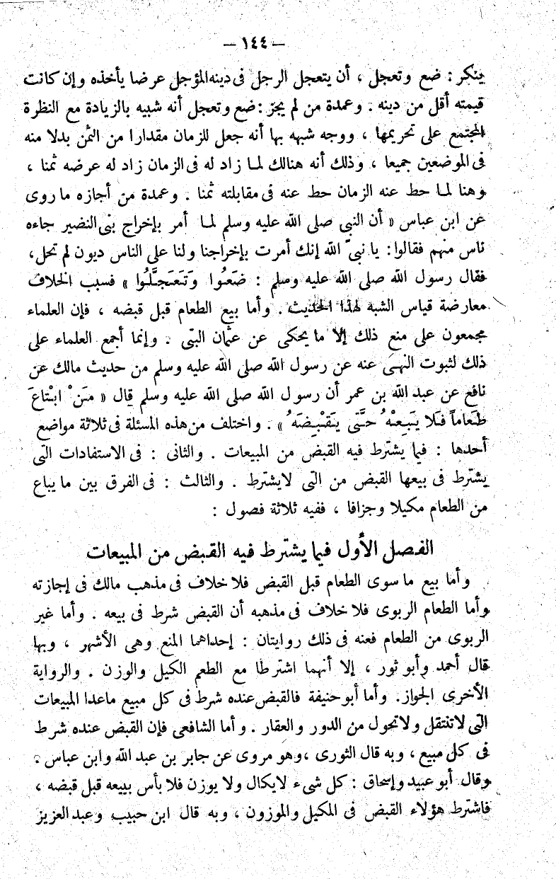 الفصل الأول فيما يشترط فيه القبض من المبيعات