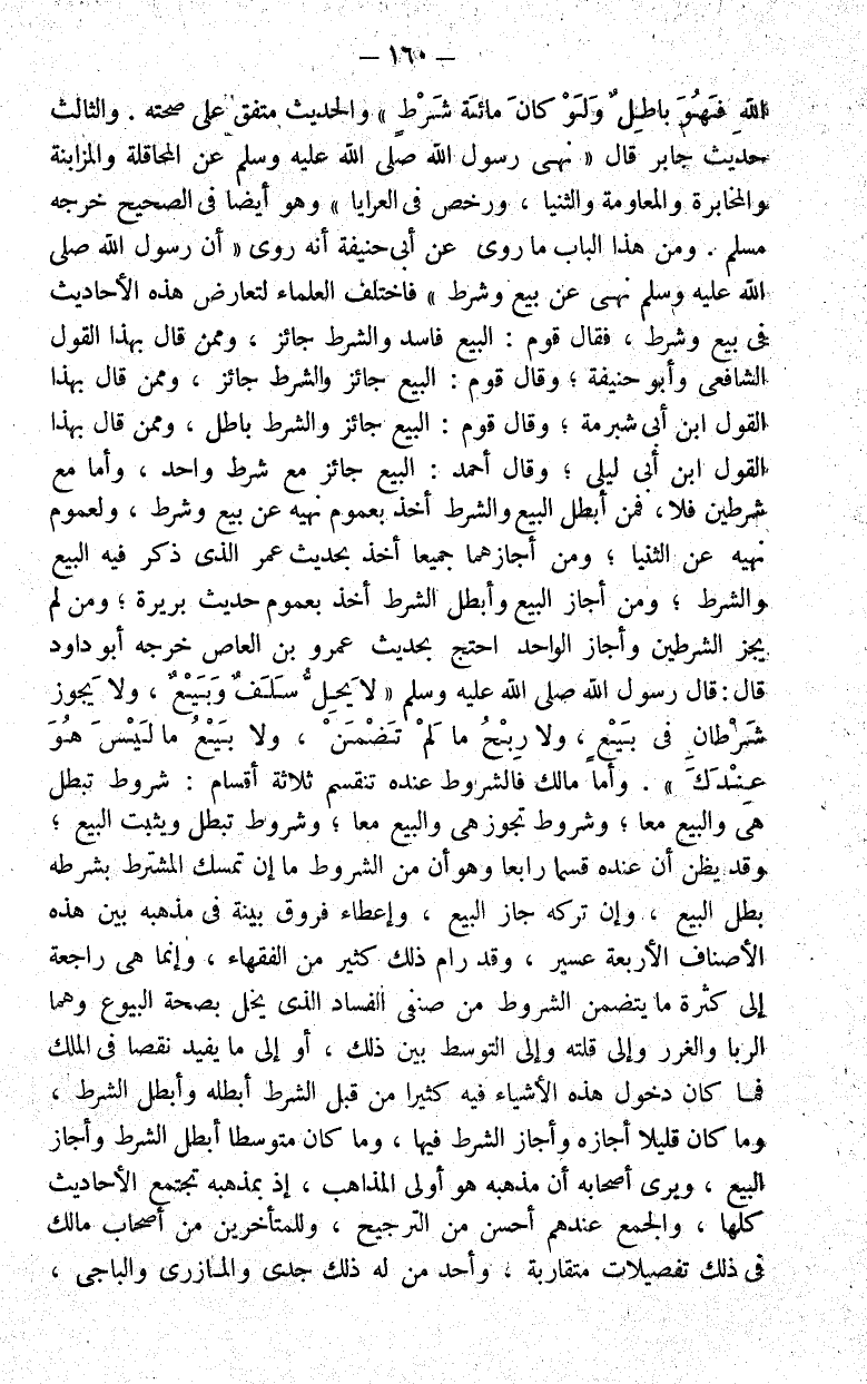 ومن هذا الباب ما روي عن أبي حنيفة أنه روى "أن رسول الله صلى الله عليه وسلم نهى عن بيع وشرط" فاختلف العلماء لتعارض هذه الأحاديث في بيع وشرط فقال قوم البيع فاسد والشرط جائز.
