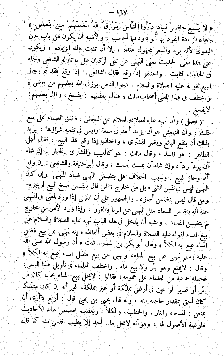 والجمهور على أن النهي إذا ورد لمعنى في المنهي عنه أنه يتضمن الفساد مثل النهي عن الربا والغرر وإذا ورد الأمر من خارج لم يتضمن الفساد ويشبه أن يدخل في هذا الباب نهيه عليه الصلاة والسلام عن بيع الماء لقوله عليه الصلاة والسلام في بعض ألفاظه " إنه نهى عن بيع فضل الماء ليمنع به الكلأ" وقال أبو بكر بن المنذر ثبت "أن رسول الله صلى الله عليه وسلم نهى عن بيع الماء ونهى عن بيع فضل الماء ليمنع به الكلأ" وقال لا يمنع وهو بئر ولا بيع ماء.