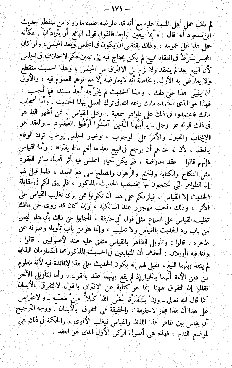 وأما القياس فإنهم قالوا عقد معاوضة فلم يكن لخيار المجلس فيه أثر أصله سائر العقود مثل النكاح والكتابة والخلع والرهون والصلح على دم العمد فلما قيل لهم إن الظواهر التي تحتجون بها يخصصها الحديث المذكور فلم يبق لكم في مقابلة الحديث إلا القياس فيلزمكم على هذا أن تكونوا ممن يرى تغليب القياس على الأثر وذلك مذهب مهجور عند المالكية وإن كان قد روي عن مالك تغليب القياس على السماع مثل قول أبي حنيفة فأجابوا عن ذلك بأن هذا ليس من باب رد الحديث بالقياس ولا تغليب وإنما هو من باب تأويله وصرفه عن ظاهره.