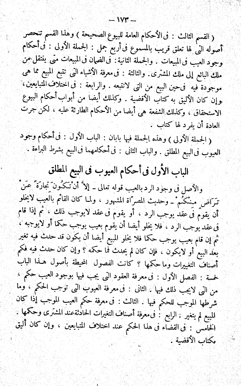 (الجملة الأولى) وهذه الجملة فيها بابان الباب الأول في أحكام وجود العيوب في البيع المطلق.