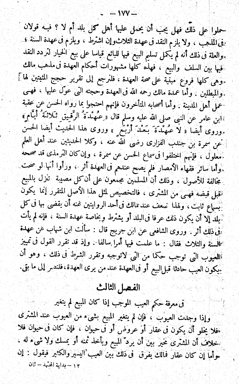 وإذ قد تقرر القول في تمييز العيوب التي توجب حكما من التي لا توجبه وتقرر الشرط في ذلك وهو أن يكون العيب حادثا قبل البيع أو في العهدة عند من يرى العهدة فلنصر إلى ما بقي.