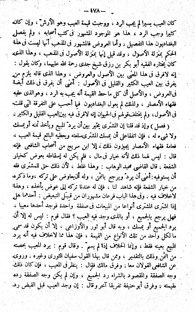وهذا الذي قاله يلزم من يفرق بين العيب الكثير والقليل في الأصول أعني أن يفرق في ذلك أيضا في العروض والأصل أن كل ما حط القيمة أنه يجب به الرد وهو الذي عليه فقهاء الأمصار ولذلك لم يعول البغداديون فيما أحسب على التفرقة التي قلت في الأصول ولم يختلف قولهم في الحيوان أنه لا فرق فيه بين العيب القليل والكثير.