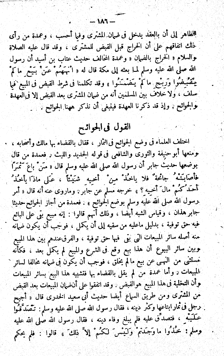 وقد اتفقوا على أن ضمان المبيعات بعد القبض من المشتري ومن طريق السماع أيضا حديث أبي سعيد الخدري قال "أجيح رجل في ثمار ابتاعها وكثر دينه فقال رسول الله صلى الله عليه وسلم :" تصدقوا عليه فتصدق عليه فلم يبلغ وفاء دينه.فقال رسول الله صلى الله عليه وسلم خذوا ما وجدتم وليس لكم إلا ذلك" قالوا فلم يحكم