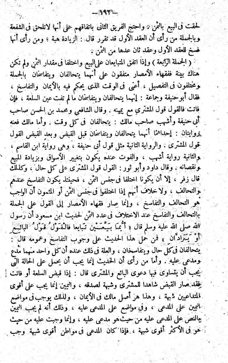 الجملة الرابعة وإذا اتفق المتبايعان على البيع واختلفا في مقدار الثمن ولم تكن هناك بينة ففقهاء الأمصار متفقون على أنهما يتحالفان ويتفاسخان بالجملة ومختلفون في التفصيل أعني في الوقت الذي يحكم فيه بالأيمان والتفاسخ.