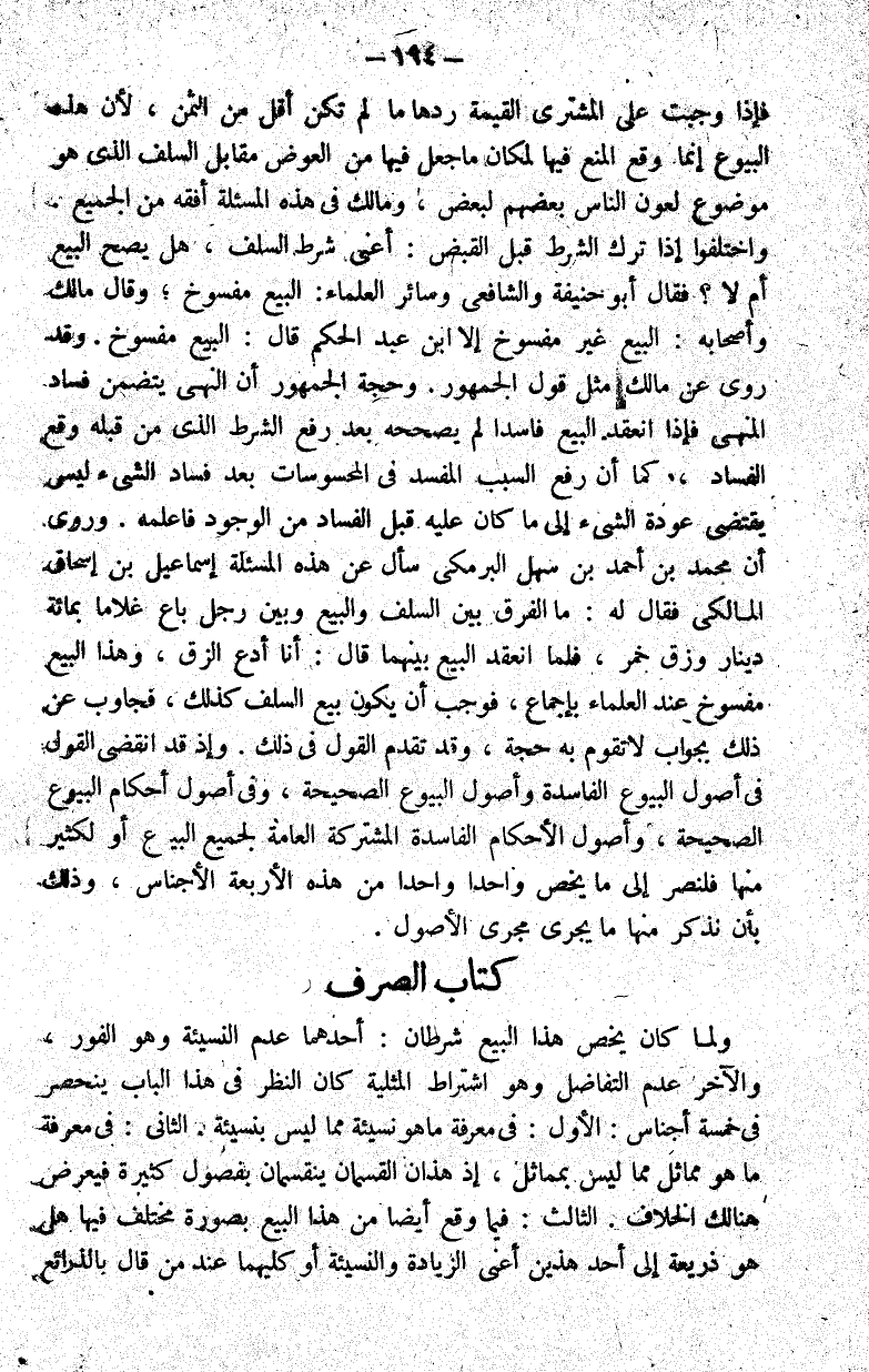 ولما كان يخص هذا البيع شرطان أحدهما عدم النسيئة وهو الفور والآخر عدم التفاضل وهو اشتراط المثلية كان النظر في هذا الباب ينحصر في خمسة أجناس الأول في معرفة ما هو نسيئة مما ليس بنسيئة.