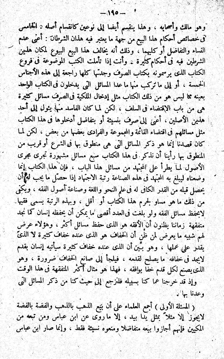 وأنت إذا تأملت الكتب الموضوعة في فروع الكتاب الذي يوسمونه بكتاب الصرف وجدتها كلها راجعة إلى هذه الأجناس الخمسة أو إلى ما تركب منها ما عدا المسائل التي يدخلون في الكتاب الواحد بعينه مما ليس هو من ذلك الكتاب مثل إدخال المالكية في الصرف مسائل كثيرة هي من باب الاقتضاء في السلف ولكن لما كان الفاسد منها يؤول إلى أحد هذين الأصلين أعني إلى صرف بنسيئة أو بتفاضل أدخلوها في هذا الكتاب مثل مسائلهم في اقتضاء القائمة والمجموعة والفرادى بعضها من بعض لكن لما كان قصدنا إنما هو ذكر المسائل التي هي منطوق بها في الشرع أو قريب من المنطوق بها رأينا أن نذكر في هذا الكتاب سبع مسائل مشهورة تجري مجرى الأصول لما يطرأ على المجتهد من مسائل هذا الباب.