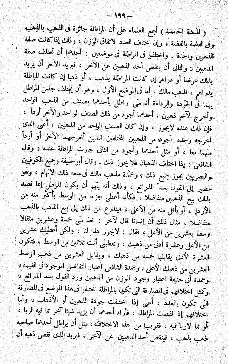 (المسألة الخامسة) أجمع العلماء على أن المراطلة جائزة في الذهب بالذهب وفي الفضة.