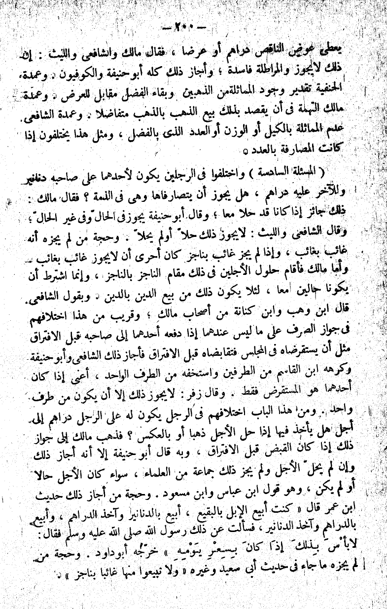 ومن هذا الباب اختلافهم في الرجل يكون له على الرجل دراهم إلى أجل هل يأخذ فيها إذا حل الأجل ذهبا أو بالعكس فذهب مالك إلى جواز ذلك إذا كان القبض قبل الافتراق وبه قال أبو حنيفة إلا أنه أجاز ذلك وإن لم يحل الأجل ولم يجز ذلك جماعة من العلماء سواء أكان الأجل حالا أو لم يكن وهو قول ابن عباس وابن مسعود.