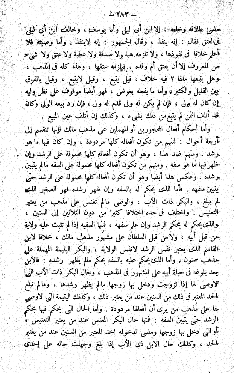 واختلف في حده اختلافا كثيرا من دون الثلاثين إلى الستين والذي يحكم له بحكم الرشد وإن علم سفهه فمنها السفيه إذا لم تثبت عليه ولاية من قبل أبيه ولا من قبل السلطان على مشهور مذهب مالك خلافا لابن القاسم الذي يعتبر نفس الرشد لا نفس الولاية والبكر اليتيمة المهملة على مذهب سحنون.