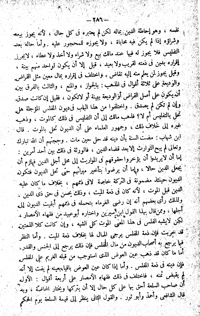 ولذلك رأى بعضهم أنه إن رضي الغرماء بتحمله في ذممهم أبقيت الديون إلى أجلها وممن قال بهذا القول ابن سيرين واختاره أبو عبيد من فقهاء الأمصار لكن لا يشبه الفلس في هذا المعنى الموت كل الشبه وإن كانت كلا الذمتين قد خربت فإن ذمة المفلس يرجى المال لها بخلاف ذمة الميت.