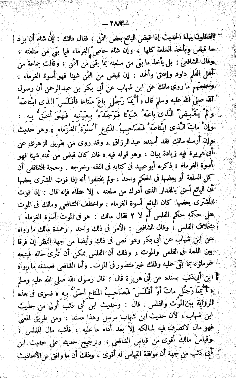 وأما الشافعي فعمدته ما رواه ابن أبي ذئب بسنده عن أبي هريرة قال قال رسول الله صلى الله عليه وسلم: "أيما رجل مات أو أفلس فصاحب المتاع أحق به" فسوى في هذه الرواية بين الموت والفلس.