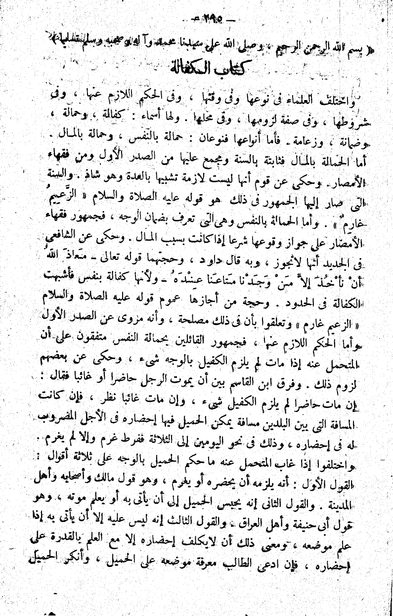 واختلف العلماء في نوعها وفي وقتها وفي الحكم اللازم عنها وفي شروطها وفي صفة لزومها وفي محلها ولها أسماء كفالة وحمالة وضمانة وزعامة فأما أنواعها فنوعان حمالة بالنفس وحمالة بالمال.