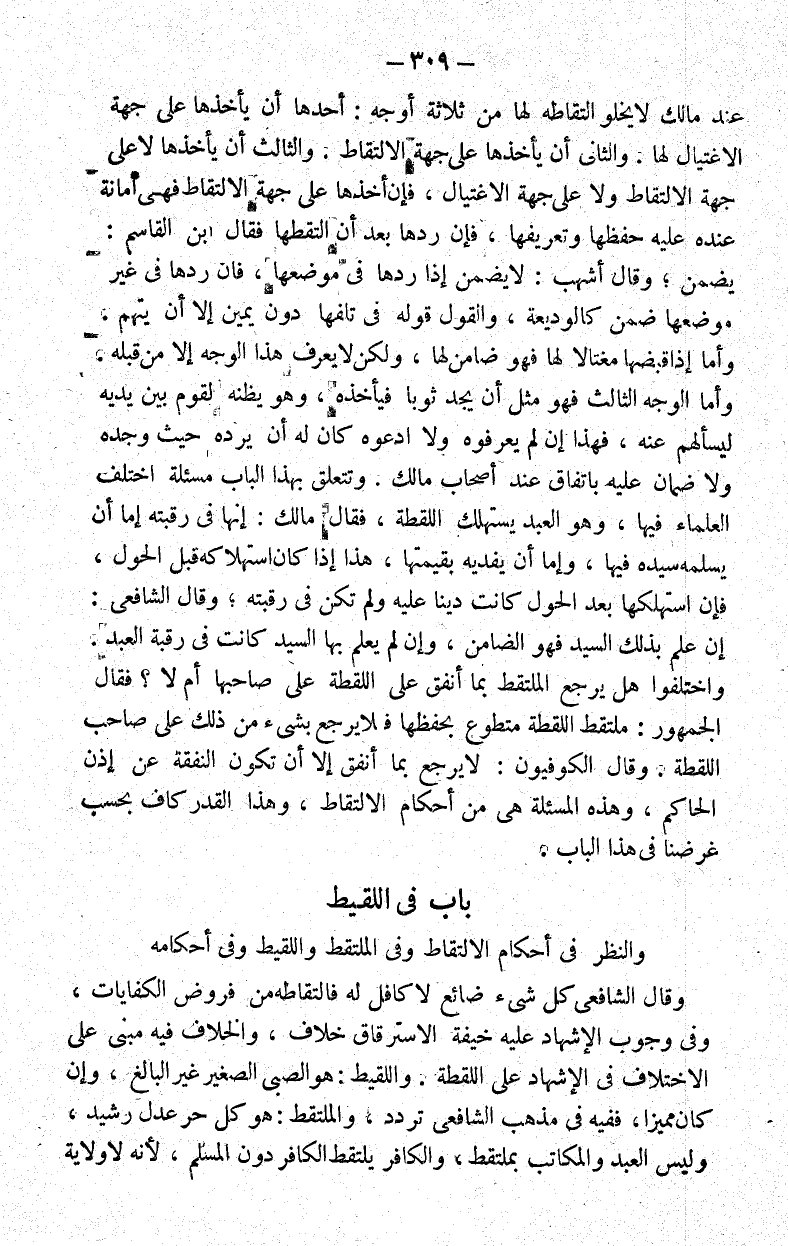 والنظر في أحكام الالتقاط وفي الملتقط واللقيط وفي أحكامه وقال الشافعي كل شيء ضائع لا كافل له فالتقاطه من فروض الكفايات وفي وجوب الإشهاد عليه خيفة الاسترقاق خلاف.