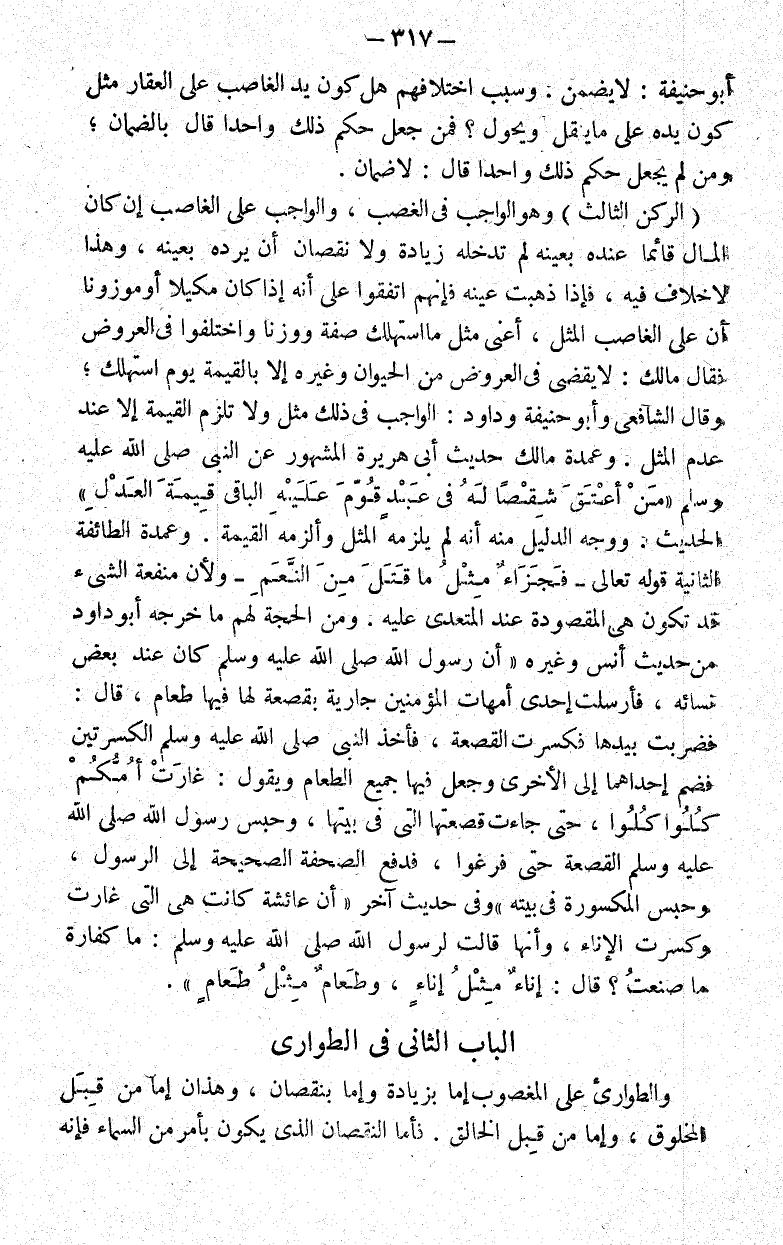 وعمدة الطائفة الثانية قوله تعالى: {فَجَزَاءٌ مِثْلُ مَا قَتَلَ مِنَ النَّعَمِ} ولأن منفعة الشيء قد تكون هي المقصودة عند المتعدى عليه ومن الحجة لهم ما خرجه أبو داود من حديث أنس وغيره " أن رسول الله صلى الله عليه وسلم كان عند بعض نسائه فأرسلت إحدى أمهات المؤمنين جارية بقصعة لها فيها طعام قال فضربت بيدها فكسرت القصعة فأخذ النبي صلى الله عليه وسلم الكسرتين فضم إحداهما إلى الأخرى وجعل فيها جميع الطعام وهو يقول غارت أمكم كلوا كلوا حتى جاءت قصعتها التي في بيتها وحبس رسول الله صلى الله عليه وسلم القصعة حتى فرغوا فدفع الصحفة الصحيحة إلى الرسول وحبس المكسورة في بيته" وفي حديث آخر "أن عائشة كانت هي التي غارت وكسرت الإناء وأنها قالت لرسول الله صلى الله عليه وسلم ما كفارة ما صنعت قال إناء مثل إناء وطعام مثل طعام".