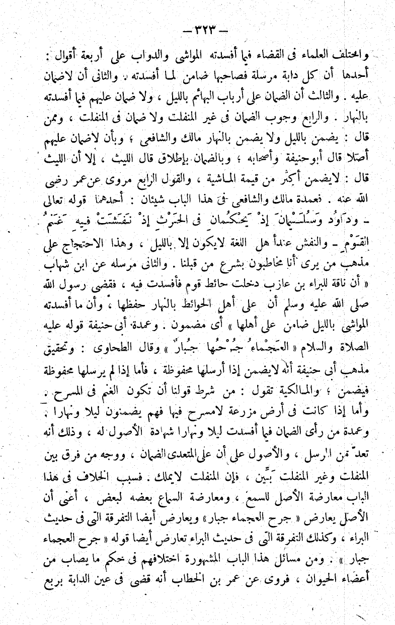 فعمدة مالك والشافعي في هذا الباب شيئان أحدهما قوله تعالى:{ وَدَاوُدَ وَسُلَيْمَانَ إِذْ يَحْكُمَانِ فِي الْحَرْثِ إِذْ نَفَشَتْ فِيهِ غَنَمُ الْقَوْمِ} والنفش عند أهل اللغة لا يكون إلا بالليل وهذا الاحتجاج على مذهب من يرى أنا مخاطبون بشرع من قبلنا والثاني مرسله عن ابن شهاب "أن ناقة للبراء بن عازب دخلت حائط قوم فأفسدت فيه فقضى رسول الله صلى الله عليه وسلم أن على أهل الحوائط بالنهار حفظها وأن ما أفسدته المواشي بالليل ضامن على أهلها" أي مضمون